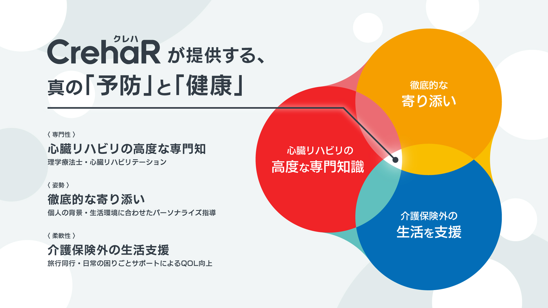 CrehaRは、経験豊富な「心臓リハビリテーション指導士」がご自宅へ伺う、自費の訪問リハビリ&生活支援サービスを提供。保険外のため制限がなく、リハビリ・生活サポート・予防ケアを自由に組み合わせ可能で、一人ひとりに合わせたオーダーメイドのケアで、安心できる在宅生活を叶えることが出来ます。